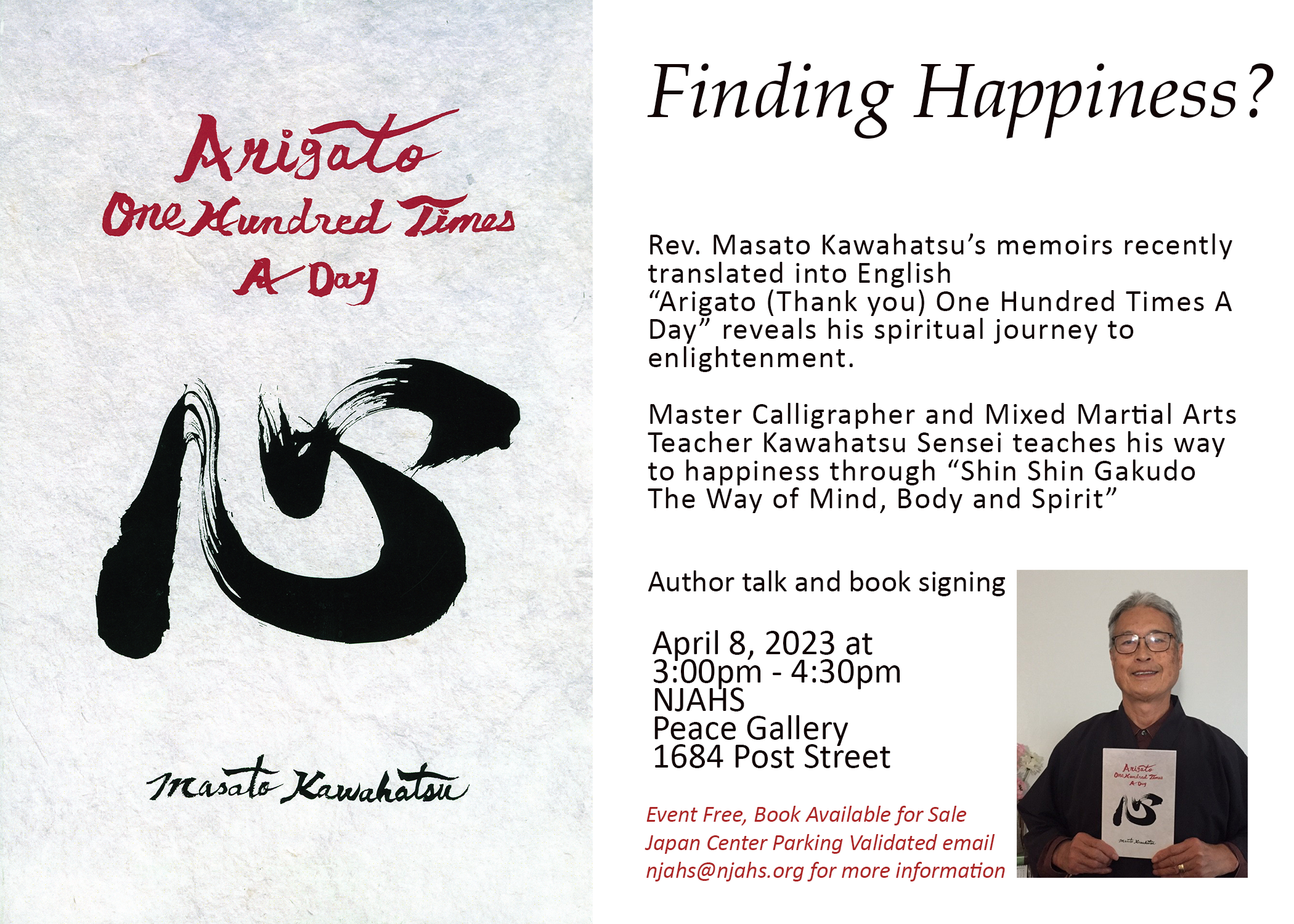 NJAHS is pleased to welcome Rev. Sensei Masato Kawahatsu for a book signing and calligraphy demonstration. Sensei Kawahatsu is a spiritual teacher, instructor in calligraphy and mixed martial arts. He strives to teach happiness and gratitude through all his work and he believes that the secret to a happy life is to say thank you more than a hundred times a day, smile, and laugh often.